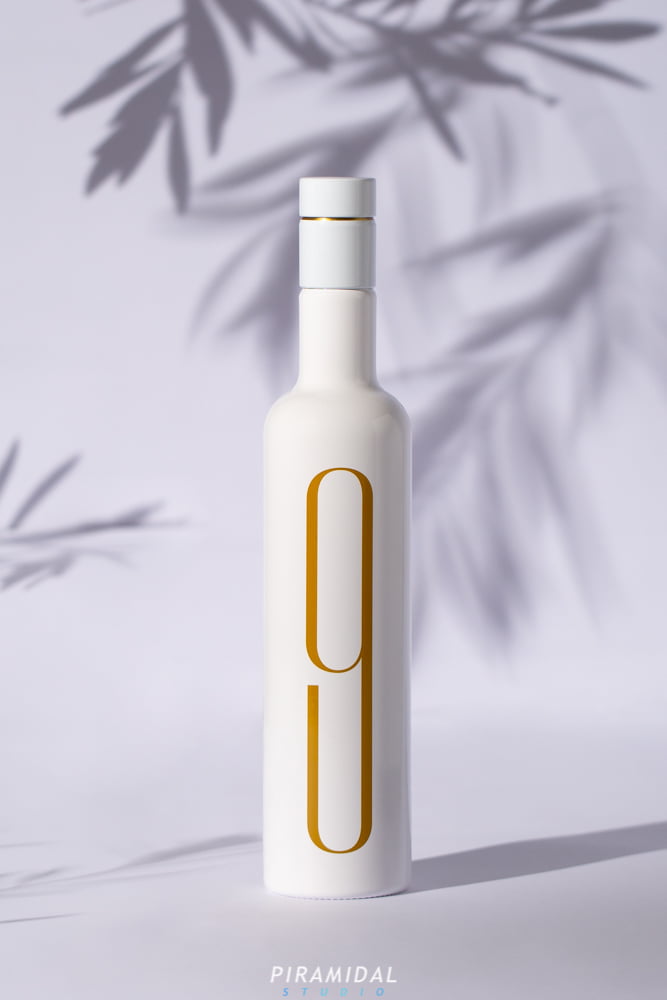 Sesión de fotos de botellas de aceite. Fotografía de producto realizada para 9 Oliveres. El lanzamiento del nuevo packaging de AOVE de la empresa 9 Oliveres requería de una fotografía igual de especial y delicada como su nueva línea visual. Es por ello que creamos 2 líneas comunicativas para sus 2 variedades de aceite. 2 líneas adaptadas al tipo de producto. Guiados por los nuevos colores del packaging creamos dos escenarios diferentes para la sesión.